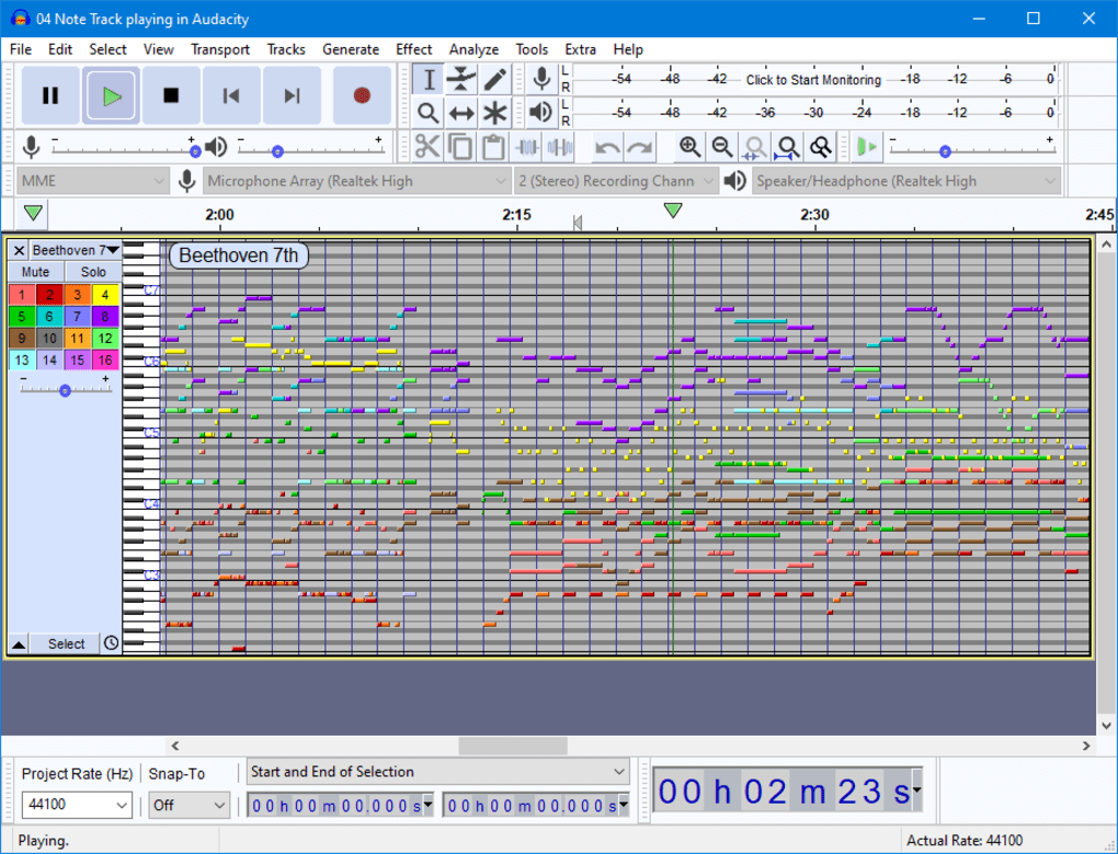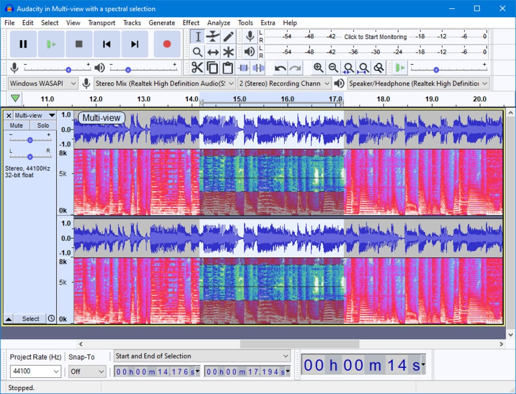 - يمكنك طبقات الملفات لإضافة المزيد من العمق إلى المشروع وإنشاء أجواء محددة. على الطرف الآخر من هذا الطيف ، يمكنك إلغاء الضوضاء من الخلفية لتطوير تجربة استماع نظيفة. من خلال وضع عرض المخطط الطيفي ، تتيح لك Audacity الخوض في التفاصيل ورسم ترددات الصوت بسهولة.