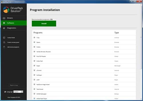 - يفحص DriverPack نظامك لتقديم برامج التشغيل الموصى بها للتثبيت من قاعدة البيانات الشاملة الخاصة بهم. تمت ترجمة المنصة إلى أكثر من 45 لغة: العربية ، والهولندية ، والإنجليزية ، واليونانية ، والكورية ، والنرويجية ، والإسبانية ، والتركية ، وما إلى ذلك. ستتيح لك البرامج المجانية استخدام أجهزتك بكفاءة أكبر. سيتم إنشاء نقطة استعادة قبل إجراء التغييرات.
