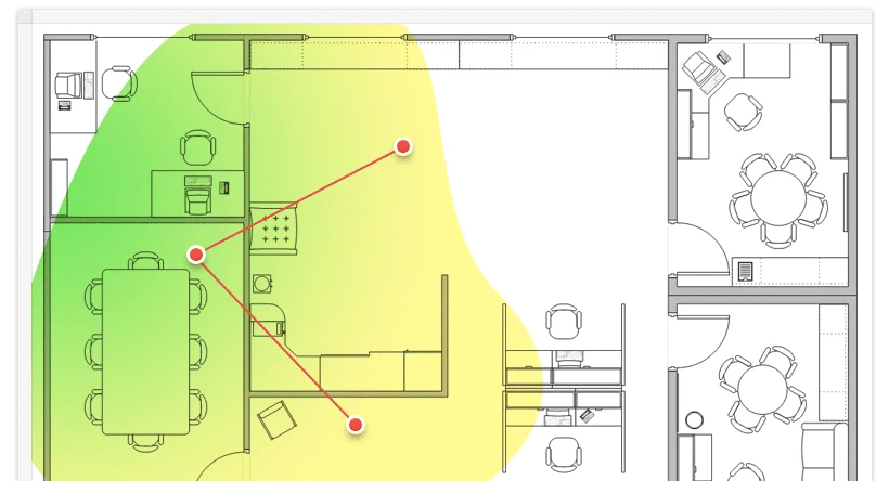 - يوفر لك التطبيق خريطة مرئية افتراضية توضح لك مدى قوة الشبكة وإمكانية وصولها إلى نقاط المساحة حال وضع الراوتر في أماكن محددة. تساعدك هذه الخريطة على تحديد المواقع الأفضل لأجهزة ال hotspot؛ وبذلك يمكنك تغطية جميع النقاط الميتة في الغرفة.