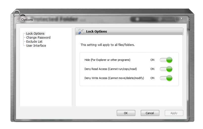 - حظر الوصول: يمكنك بسهولة حظر الوصول إلى الملفات والمجلدات والبرامج التي تختارها. يمكنك أيضًا حماية مجلد وملفاته بكلمة مرور حتى يتمكن الآخرون من رؤيته ولكن لا يمكنهم الوصول إلى محتوياته أو قراءتها أو عرضها.