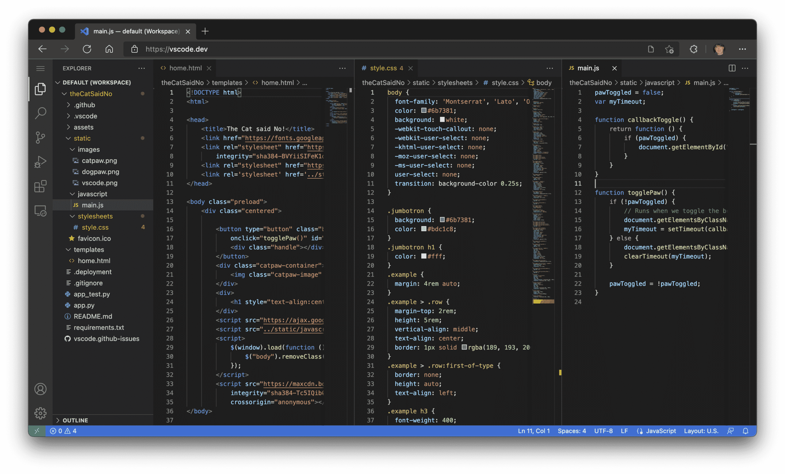 - من السهل التعامل مع الواجهة ، حيث إنها تستند إلى نمط مستكشف مشترك ، مع وجود جزء على اليسار ، يعرض جميع الملفات والمجلدات التي يمكنك الوصول إليها ، وجزء محرر على اليمين ، والذي يعرض المحتوى من الملفات التي فتحتها. في هذا الصدد ، تم تطوير المحرر بشكل جيد ، وهو يرضي العينين. كما أن لديها وظائف جيدة ، حيث يعمل الاستكشاف والإكمال التلقائي بشكل جيد مع JSON و CSS و HTML و {less} و Node.js.